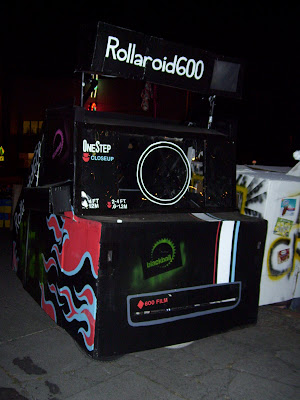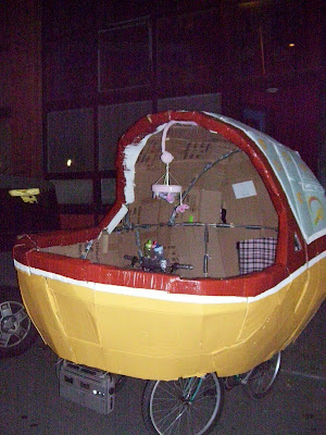 Forget the dead babies. Saturday night the cardboard cars showed up in Ballard and parked their creations on the street in front of the Ballard Eagles Club stealing the spotlight from the scooter set and moped kids. Cardboard boxes and old bicycles turned Rollaroid (Polaroid with actual flashbulb), baby bassinet, helicopter, cock with glowing eyes, Lego's and more! Got to love that creativity and originality around town.